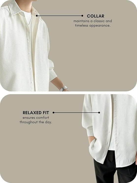 BASSIQ Men’s Textured Popcorn Shirts Stylish Spread-Collar Long-Sleeve Casual Shirt for Men (White_X-Large) : Clothing & Accessories