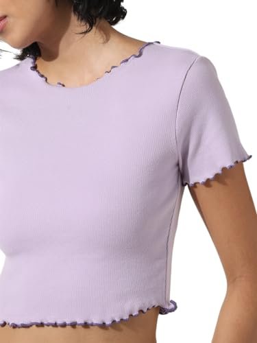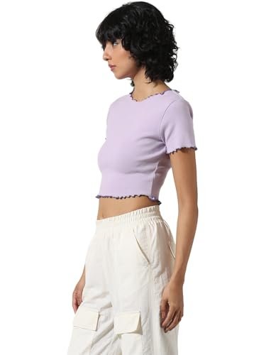 Buy ONLY Women Solid Cotton Crop Length Slim Fit Purple T-Shirt at