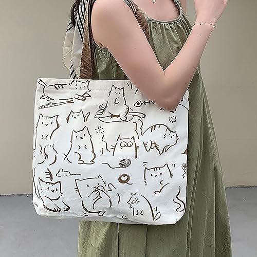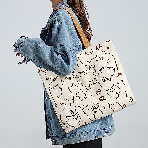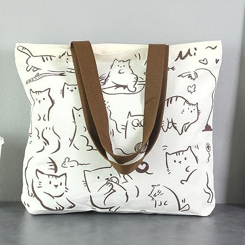 Buy wolpin Women Reusable Shopping/Grocery Classic Tote Bag With Pocket Shoulder Cotton Handbag Zipper Closure Travel Bag Multi-Purpose, Funny Cat, Beige at